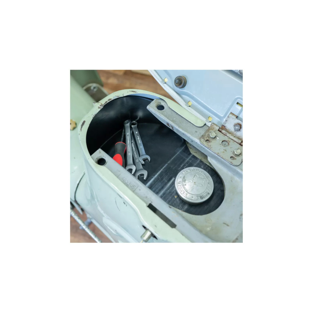 A formatartó gumiból, fröccsöntési eljárással készült szerszámtálca rendkívül egyszerűen rögzíthető a tanksapkánál, majd a burkolat alá kell benyomni. Ehhez a hátsó burkolatot nem kell leszerelni. Rugalmasságának köszönhetően minden KR51 modellen jól illeszkedik, és nemcsak arról gondoskodik, hogy az apróbb alkatrészek, például az anyák és csavarok biztonságosan tárolhatók legyenek, hanem arról is, hogy a tank és a burkolat fényezése sértetlen maradjon.